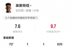 体育资讯1月25日讯 英超第23轮,切尔西客战水晶宫,埃斯特旺首发出战,传射建功,他还送出1次关键传球,1次过人成功,但也错失1次进球机会,评分7.6。