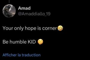 当博主回复“别再发信息来了”后,阿玛德又补了一句:“你唯一的希望就是角球了🤣保持谦逊吧孩子(闭嘴表情)(Your only hope is corner. Be humble KID)