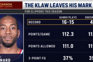 据统计,在伦纳德出战的比赛中,快船战绩16胜15负,场均得分112.3分,场均失分111.0分,球队三分命中率37%;