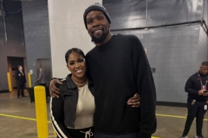 体育资讯1月17日讯 帕金斯更新社媒,晒出了他的妻儿去看火箭比赛,并在后台和杜兰特寒暄的照片。