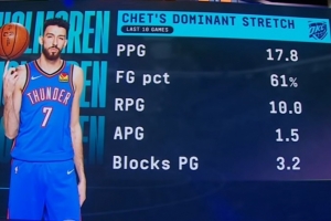 据统计,在最近10场比赛中,霍姆格伦场均可以得到17.8分10篮板1.5助攻3.2盖帽,投篮命中率高达61%!